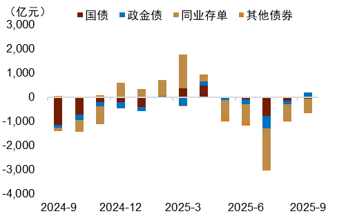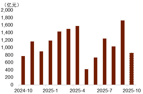 跨境资金的双向波动态势明显,南向资金与外资持有的债券规模变动延续了此前趋势。股市来看,EPFR数据显示外资在近几个月整体倾向流入国内股市,不过10月规模有所减少(图表10)。南向资金流出规模在9月保持高位,不过10月有所降低,为848.8亿元,是6月后的最低点(图表11)。债券市场来看,外资持有境内银行间债券规模9月减少445.7亿元,为连续5个月减少(图表12)。