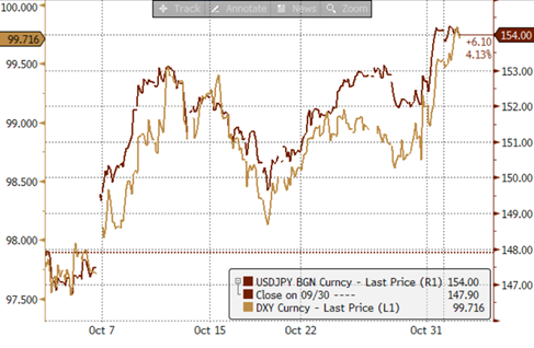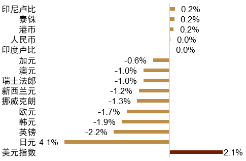 ► 10月美元延续了9月FOMC会议之后的反弹走势,整体依旧维持在年内低位震荡。一方面,PMI为代表的美国经济数据依旧展示出一定韧性,另一方面,其他G10非美货币,尤其是日元的大幅下跌也支撑了美元的反弹走高。而随着10月FOMC如期兑现25基点的降息预期,但美联储内部的分歧并未减弱,而发布会上鲍威尔对市场关于12月的降息预期明显有所打压,这使得本次会后市场做出明显鹰派解读。而美元也继续获得支撑反弹至8月以来高点附近。总体看,美元指数自10月初的97.50附近一度上涨至99.80附近,截至10月31日收盘,美元指数最终收涨2%左右。