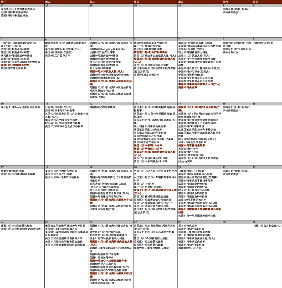 11月关注高市政策实施与日本央行官员发言 11月期间日本并无太多重要政治与经济日程,我们认为高市早苗在11月内或更多专注于国内政策的实施,同时在近期日元贬值明显的背景下,日本政府如何牵制日元贬值也值得关注。11月期间并无日本央行议息会议,但是有多场日本央行官员讲话,我们认为日本央行若在12月实施加息,则有必要提前数周同市场积极沟通,我们建议投资者留意相关事件。总体而言,我们认为11月期间日元汇率中或仍旧存在贬值压力,美日汇率的区间或在152-158,中枢或在154。