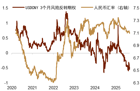 在美元反弹力度趋于温和,中间价或保持升值以及人民币季节性逐步出现的预期下,我们认为人民币汇率年内有望保持升值趋势。具体而言,近期鲍威尔关于12月可能不会降息的表态[15]令市场的降息预期已经出现一定回摆。随着美国政府持续关门,市场对美国劳动力市场偏弱的担忧延续,我们认为市场进一步缩减降息预期的空间相对有限,美元趋势性回升的可能性或偏低。此外,中美已在10月达成一系列经贸协定,短期内出现反复的可能性偏低。因此,我们认为外部环境对人民币汇率的影响整体偏向温和。从内部因素来看,临近年底,人民币升值的季节性或逐步出现,或有必要温和引导释放相关的结汇需求,推动人民币汇率中枢逐步下移。另一方面,近期中美经贸关系出现好转,美国减少了对华10%的“芬太尼”关税,亦部分减轻外贸企业压力,人民币对一篮子货币也有升值空间。中间价或有望保持渐进的升值幅度。综合来看,我们认为在外部环境保持温和,内部环境较为积极的综合影响下,人民币在临近年末的时期或有一定升值空间。