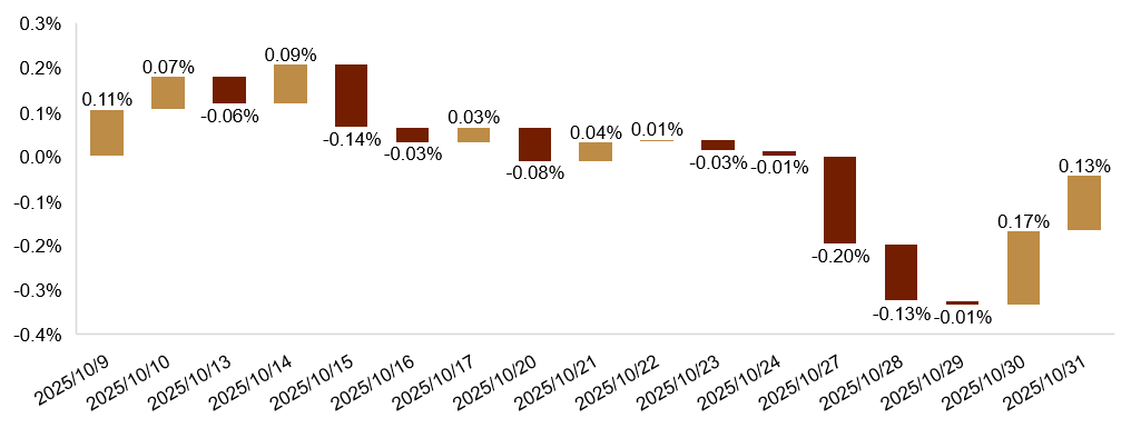 关注美国政府停摆何时结束 到目前为止美国政府已经整整停摆一个月,而尽管有诸多严重的后果摆在政府面前(比如联邦政府对低收入人群的食物救济项目面临被切断风险),市场依旧没有看到短期内政府停摆结束的迹象。国会议员Jeanne Shaheen近期表示[20],当前两党之间并没有任何正式的协商,而双方的一些律师甚至想要目前的政府停摆状态一直持续下去。市场预期来自联邦政府雇员和美国群众的压力大概率会在11月有所上升,但政府停摆的状态可能会延续至感恩节(11月27日)前后,因为届时来自于出行和交通运输的混乱可能会使得两党的律师们最终有所妥协。总体看,我们认为美国政府停摆的时间越久,其对美国经济和就业产生影响可能越大,进而使得美联储降息节奏定价再度进行切换的概率就越高。而在政府恢复正常运转之前,美联储大概率会保持谨慎的态度不会轻易暗示下一步行动的方向。