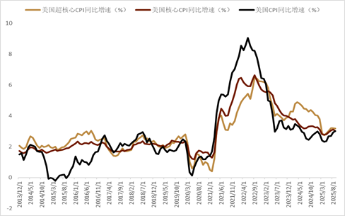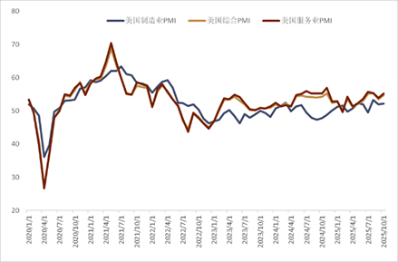 10月FOMC会议如期降息25基点 内部分歧依旧明显且整体基调偏鹰美联储在10月的FOMC会议上如期降息25基点[16],FOMC还决定自12月1日起结束缩表。但发布会上鲍威尔表示,12月再次降息并非确定的事。FOMC内部各票委意见分歧非常大:某些票委认为是时候暂停一下了。尽管由于美国政府停摆,一些重要的联邦政府数据延迟公布,但目前美联储仍然能获得的公共与私营部门数据表明,自9月FOMC会议以来,就业与通胀前景并没有太大变化。有关劳动力市场,鲍威尔表示,由于政策具有限制性的缘故,就业市场仍然在降温,但并未发现就业市场的疲软问题明显加剧,职位空缺数据的确表明市场在最近保持稳定。劳动力供应目前的下降,影响到就业市场。美联储一直密切关注企业裁员的决定。而关于通胀,他表示9月CPI比预期的更加温和。剔除住房之后的服务业通胀一直呈现出单边走势。而剔除关税后的核心PCE可能处于2.3%或2.4%附近。至今非关税类的通胀并没有远离2%通胀目标。美联储的基本预测是,还将出现一些额外的由关税引起的通胀。